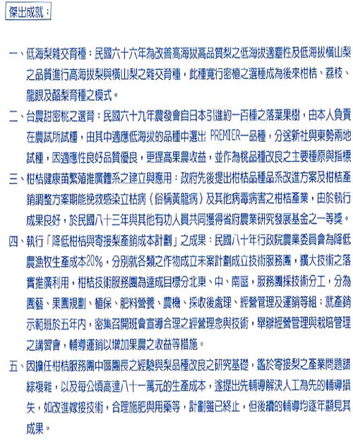 嘉義農試所園藝系系主任 果樹育種(梨、柑橘)