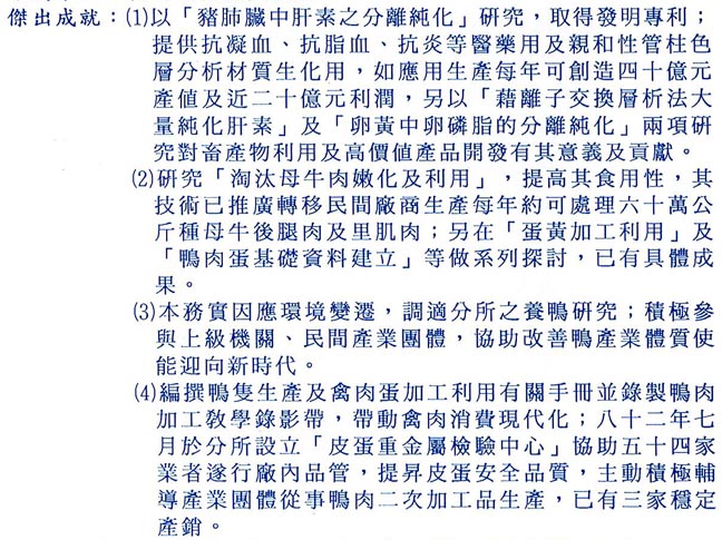| 「豬肺臟中肝素之分離與純化」中央標準局發明專利權 | (81年) | | 台灣省政府模範公務人員 | (84年) | | 八十八年度中華民國技術及職業教育名人 | | | 「帶殼蛋質地與成分的改質方法」中央標準局發明專利權 |