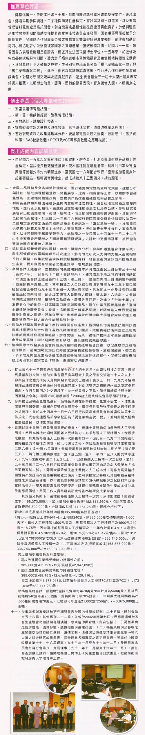 鄭裕信近5年共發表學術研究及論文報告55篇研究成果卓著,又在台灣與法國合作計畫中扮演融媒角色,於1999年與2006年分別協助辦理完成「台法農業科技合作學術研討會」,擴大雙方在畜產、水產、林業及農業的學術合作領域,這次榮獲96年度中國畜牧學會學術獎,是畜產試驗所莫大的榮譽。