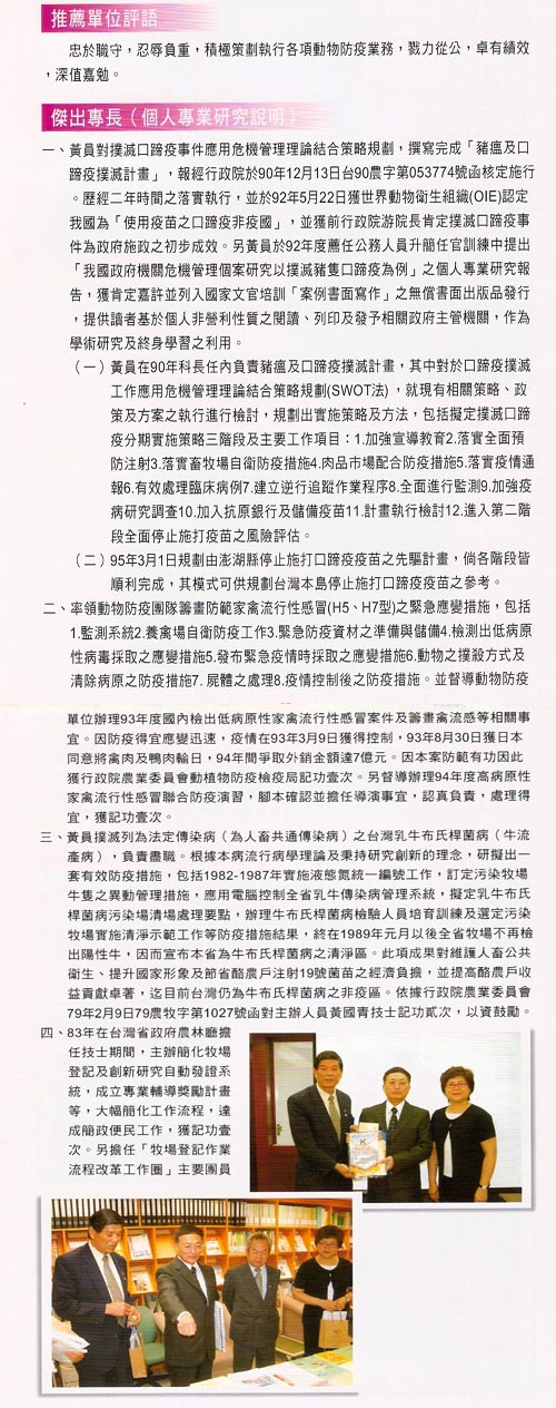 專 長:動物防疫與危機管理、獸醫行政與畜牧污染防治、口蹄疫個案研究