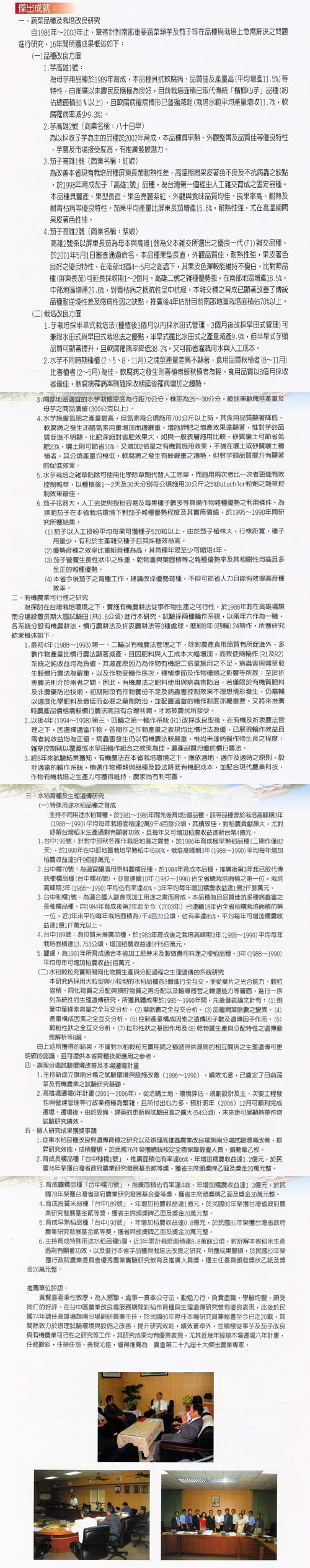 高雄區農業改良場研究員兼秘書、專精芋頭、茄子、水稻等育成及推廣