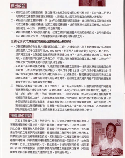 台灣動物科技研究所研究員 動物基因轉殖及複製、幹細胞